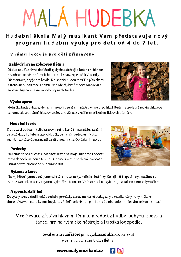 Již několik měsíců pečlivě pracujeme na nové metodice programu Malé hudebky, do které jsme zařadili také výuku na zobcovou flétničku pro děti od 4 do 7 let. |