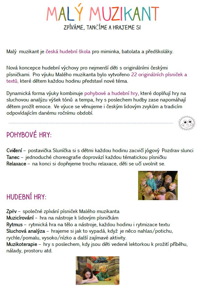 Milí rodiče, prarodiče a přátelé Malého muzikanta, tato škola vznikla díky mojí velké lásce k hudbě a dětem. Jako profesionální pedagog jsem se mnoho let věnovala dospělým, učila je zpívat a celkově se hudebně rozvíjet.